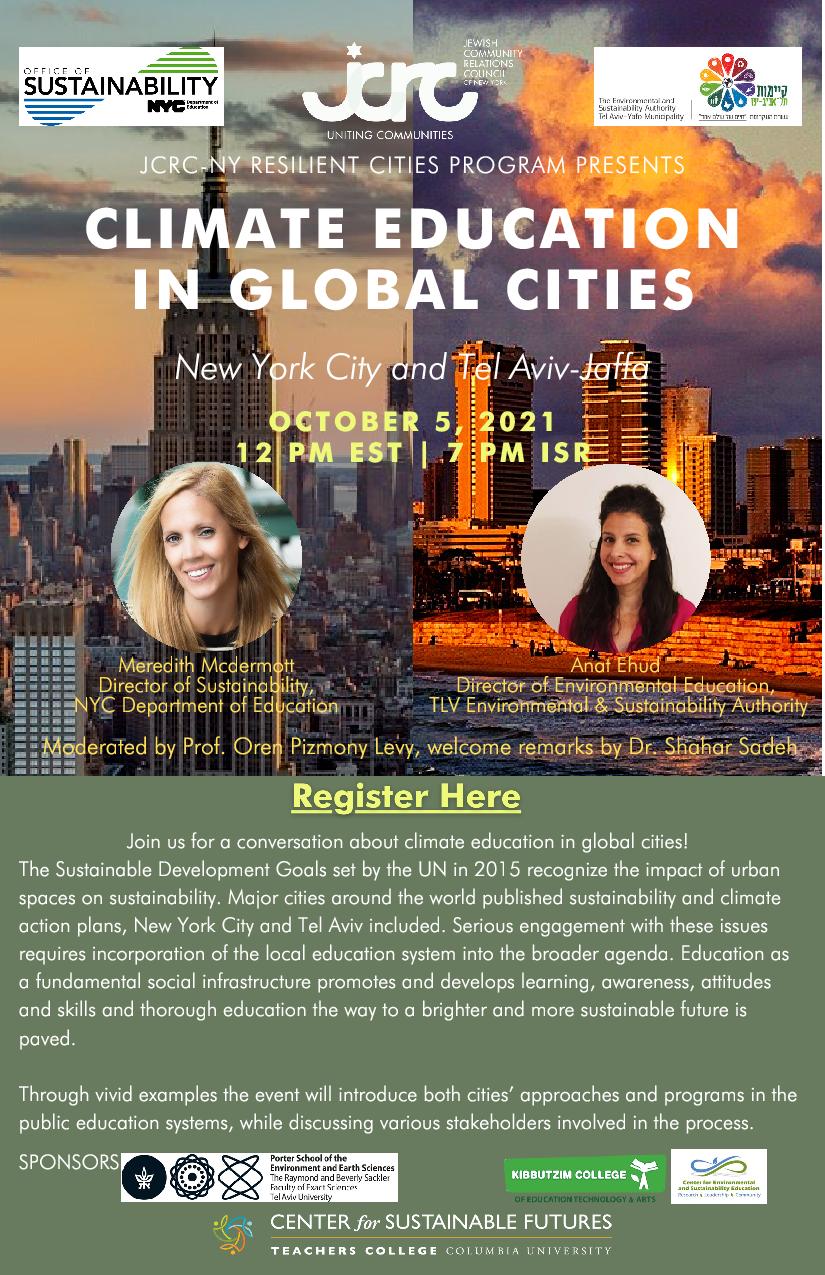 The Sustainable Development Goals set by the UN in 2015 recognize the impact of urban spaces on sustainability. Major cities around the world published sustainability and climate action plans, New York City and Tel Aviv included. Serious engagement with these issues requires incorporation of the local education system into the broader agenda. Education as a fundamental social infrastructure promotes and develops learning, awareness, attitudes and skills. Through education, the way to a brighter and more sustainable future is paved. At this event, policymakers from two global cities introduced their cities' approaches and programs in the public education systems, while discussing various stakeholders involved in the process. Our speakers included Dr. Shahar Sade from the Jewish Community Relations Council of New York, Meredith McDermott from the Office of Sustainability at the New York City Department of Education, and Anat Ehud from the Environmental and Sustainability Authority of Tel Aviv-Jaffa. TC Faculty Member and Founding Director of the Center for Sustainable Futures, Oren Pizmony-Levy, moderated the discussion.